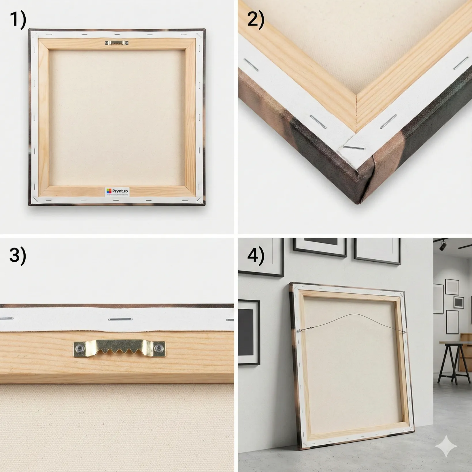 Fiecare tablou este asamblat manual și include sistemul de prindere pe perete. Primești tabloul gata de expus, fără nicio pregătire suplimentară.
